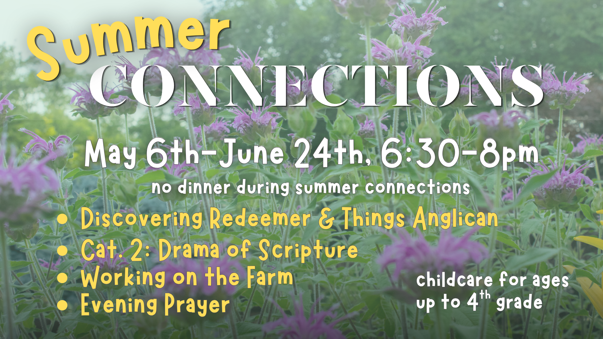 Dinner will not be offered during Summer Connections, but feel free to come early and enjoy a picnic dinner before we gather. Childcare will be available for kids up to 4th grade.