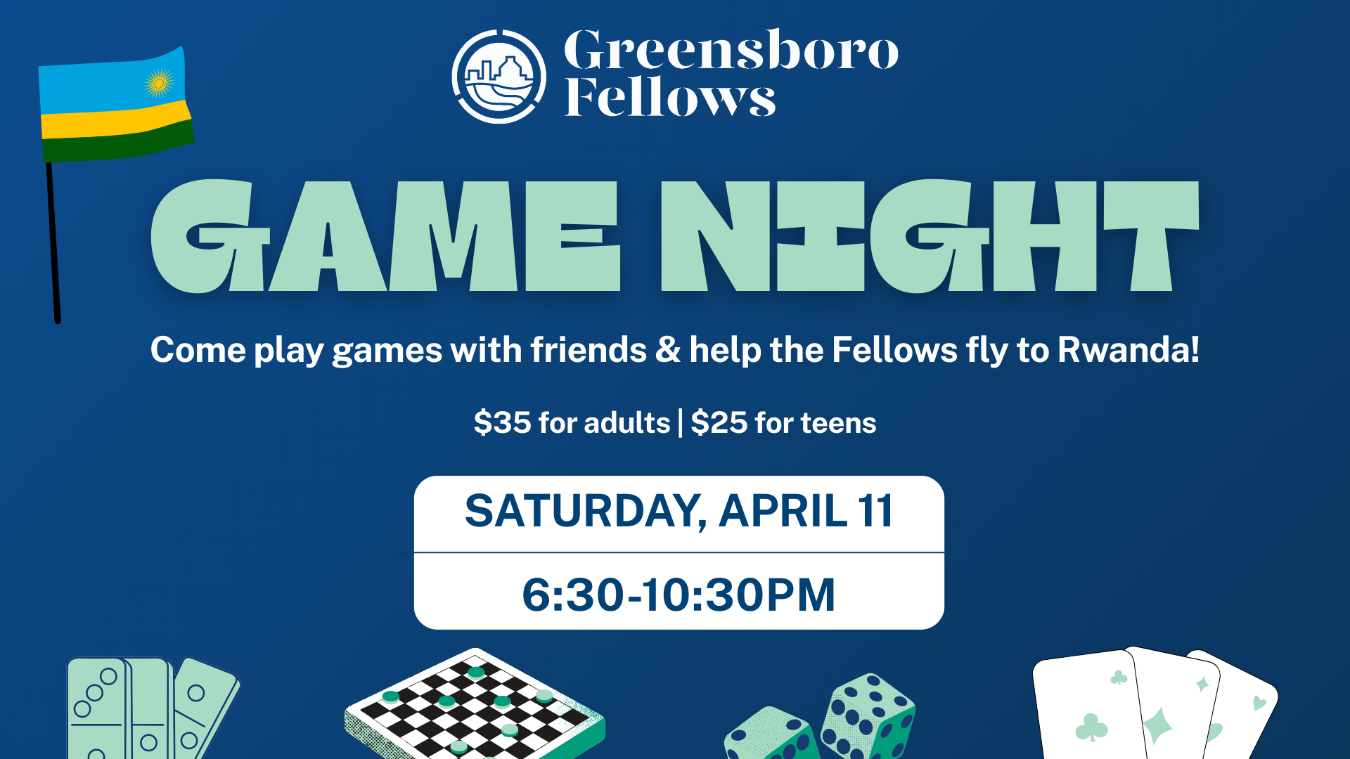 Get ready for a night of fun and games as we host a Game Night fundraiser on Saturday, April 11th from 6:30-10:30pm benefiting the Fellows trip to Rwanda! This event is open to all and will feature a variety of games, pizza, snacks, and drinks. Tickets are $35 for adults and $25 for youth (ages 12-18)! Mark your calendars, invite your friends, and RSVP at the link below!