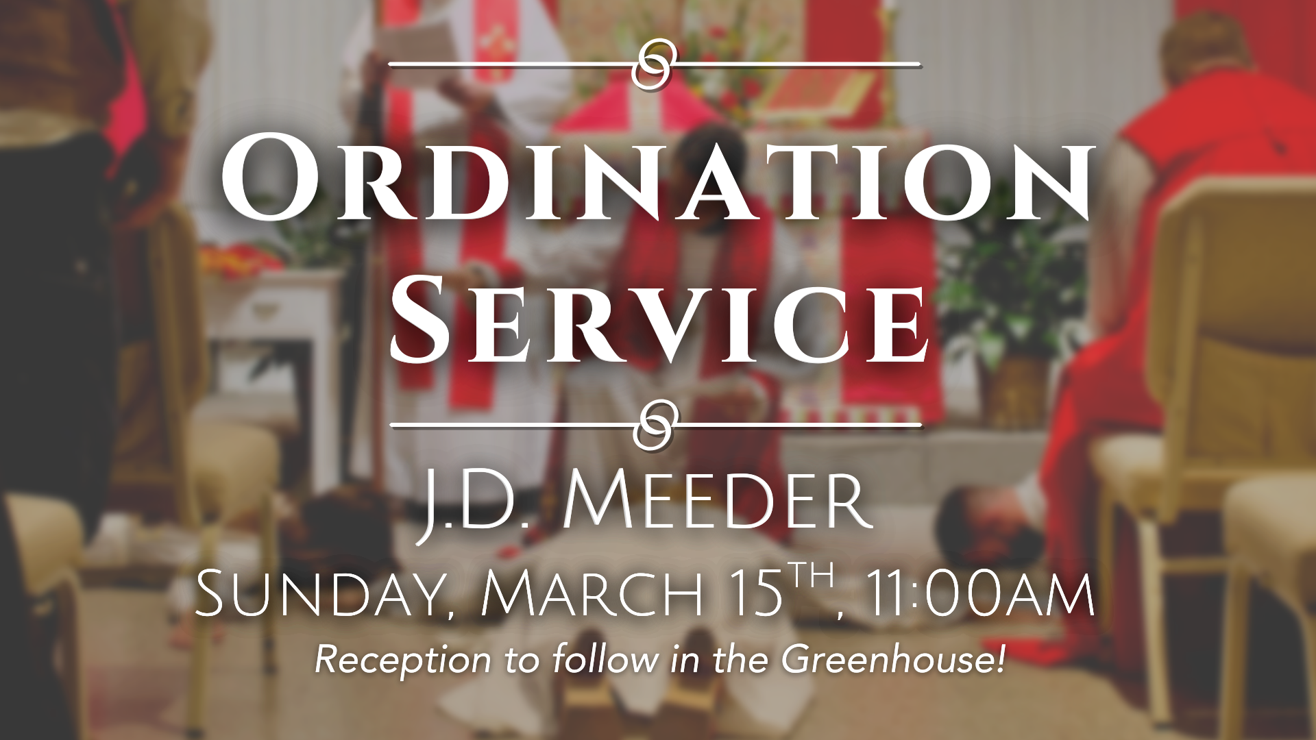 On Sunday, March 15th at 11:00am we will be having a service of ordination into the priesthood for J.D. Meeder. After the service, all are welcome to join us for a reception in the Greenhouse.