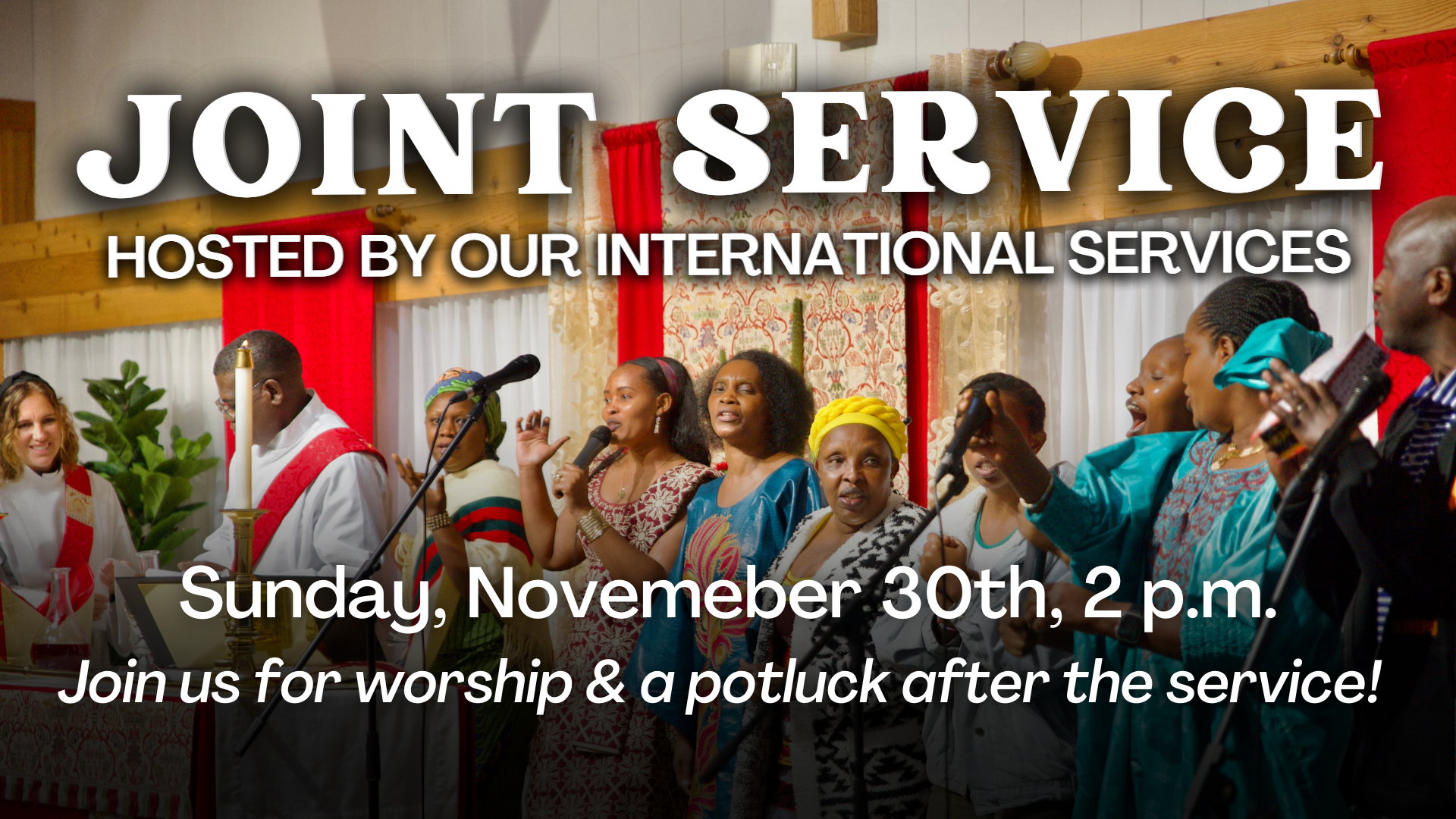 Our next Joint International Service is on Sunday, November 30th starting at 2pm. On the last Sunday of the month, our afternoon international services host this joint service for all three of our congregations (English-speaking, Sudanese, and East African congregations) to worship and fellowship together as one body. Be sure to stay after the service for a time of fellowship and feasting (bring a dish to share)!